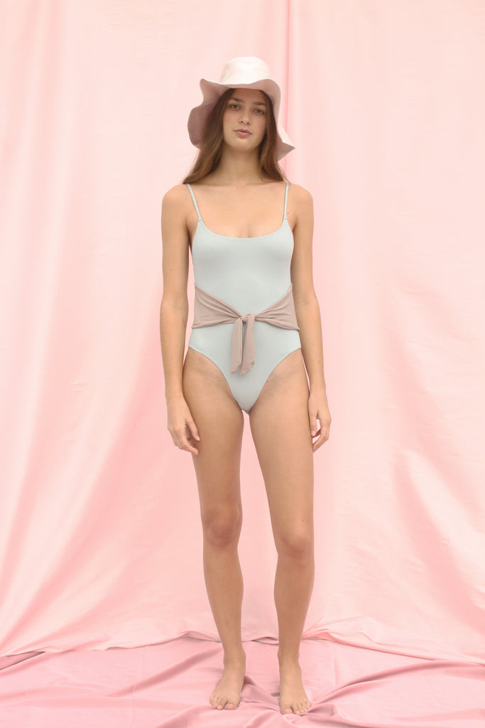 A new style for Resort '19 ! A classic one-piece shape with a sash tie for a flattering silhouette, in powder blue and pewter contrast. This suit with its highrise leg, scoop front and low back is ultimate comfort whilst still looking chic at the beach.